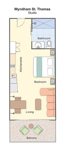 The Studio Suite has a king bed in an open area, with a bathroom, living room with dining room table, and partial kitchen (coffee maker, microwave, refrigerator, dishwasher, dishes and flatware, and toaster). General amenities: Wi-Fi, balcony/deck, air conditioning, heating, and cable TV. Max occupancy 2, 324 sq. feet. Studios are located poolside near the beach and main resort amenities.