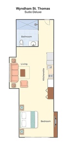 The Studio Plus suite has a king bed, with a bathroom, living room, sleeper sofa, partial kitchen (including coffee maker, microwave, refrigerator, dishwasher, dishes and flatware, and toaster). General amenities: Wi-Fi, balcony/deck, air conditioning, heating, and cable TV. Max occupancy 4, 503 sq. feet. These suites are located on the hillside of the resort which requires a short walk or golf cart ride down to the beach and main resort amenities.