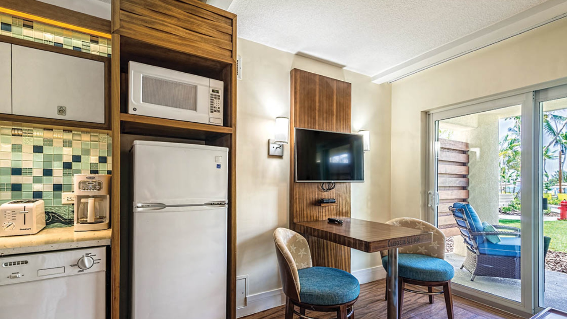 The Studio Suite has a king bed in an open area, with a bathroom, living room with dining room table, and partial kitchen (coffee maker, microwave, refrigerator, dishwasher, dishes and flatware, and toaster). General amenities: Wi-Fi, balcony/deck, air conditioning, heating, and cable TV. Max occupancy 2, 324 sq. feet. Studios are located poolside near the beach and main resort amenities.
